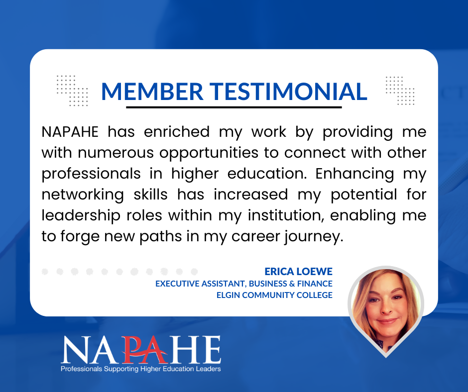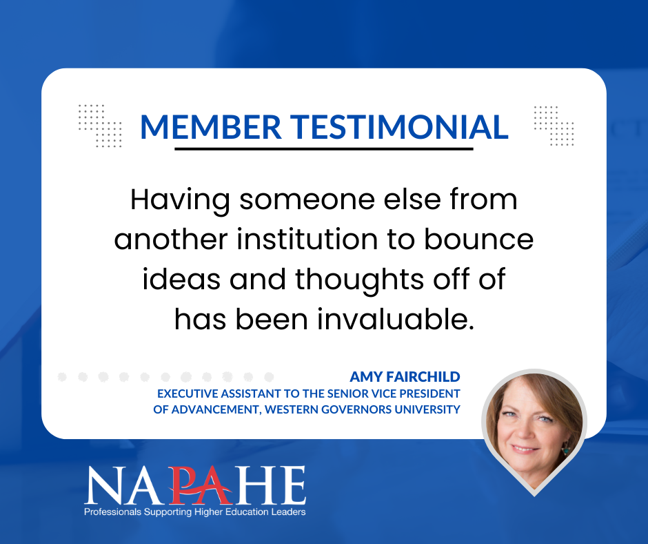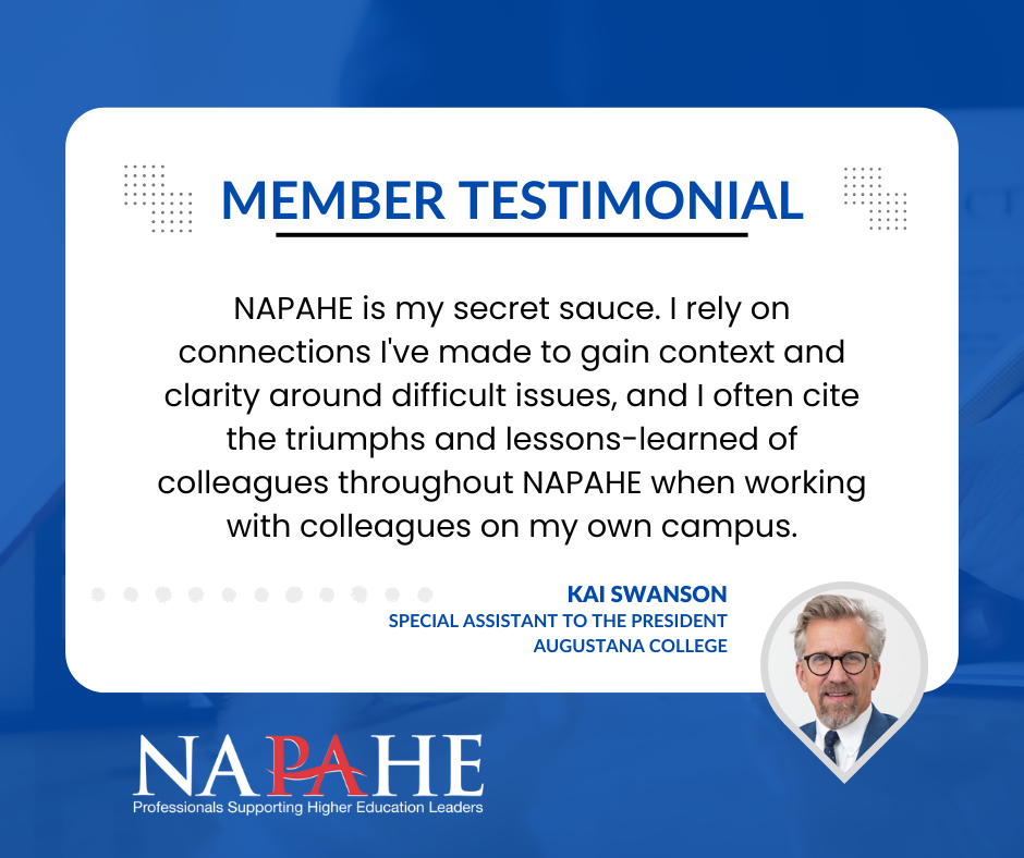 Whether you support advancement, student affairs, finance, or another division, your role is essential to the success of institutional leadership. NAPAHE connects you with a diverse community of professionals who share your commitment to operational excellence and strategic support. Through tailored resources and peer learning, NAPAHE helps you navigate the complexities of your division and grow in your career.
