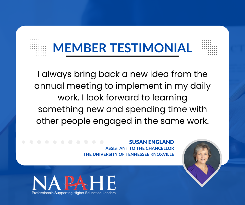 The National Association for Presidential Assistants in Higher Education (NAPAHE) is the premier professional community for individuals who support senior leaders in higher education. Here, you’ll find connection, growth, and inspiration.